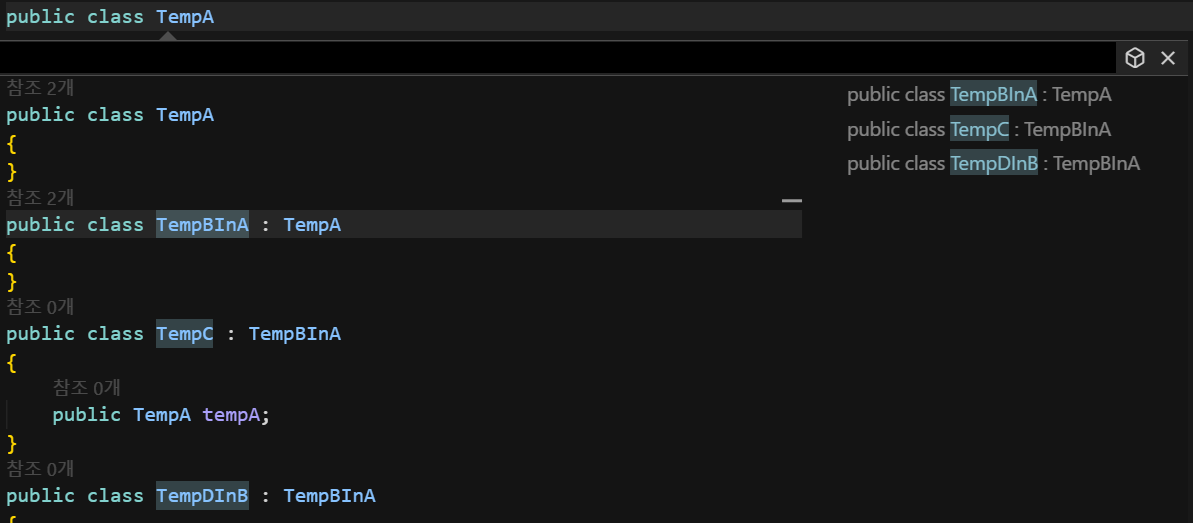 이전에 사용하던 참조 확인(Shift+F12)은 TempC 클래스에 있는 변수도 표시되지만
